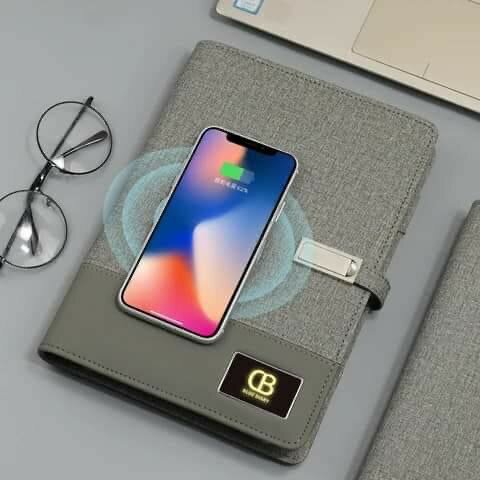Carnet de notes élégant avec chargeur sans fil intégré. Rechargez vos appareils facilement tout en prenant des notes. Idéal pour les professionnels en déplacement. Matériaux de haute qualité avec un design moderne.