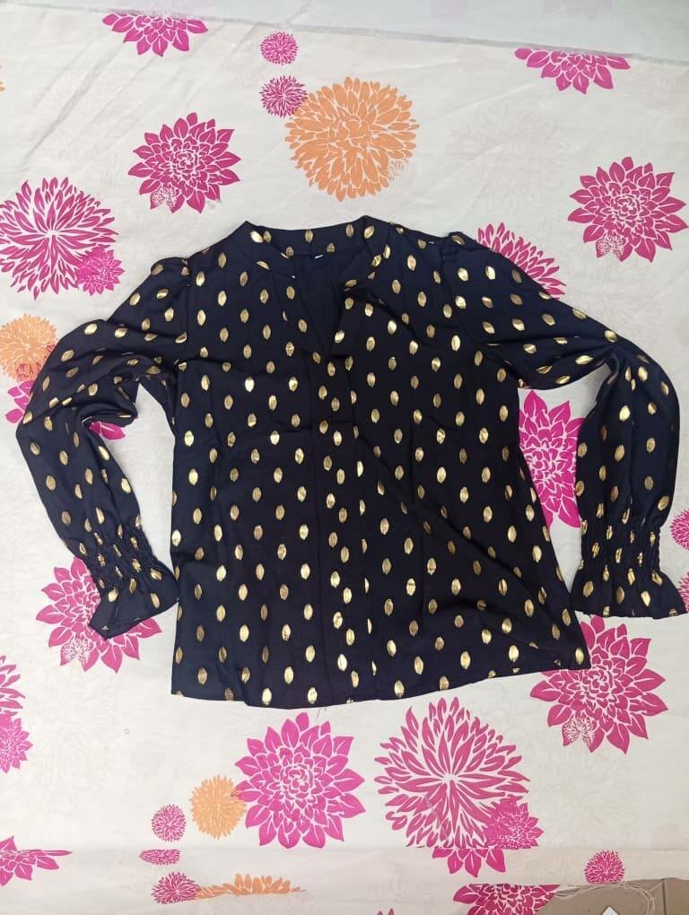 Cette élégante blouse noire à motifs dorés est idéale pour un look chic et sophistiqué. Confectionnée dans un tissu léger et confortable, elle se prête parfaitement aux occasions formelles comme aux sorties décontractées. Associez-la avec une jupe ou un pantalon pour un style impeccable.