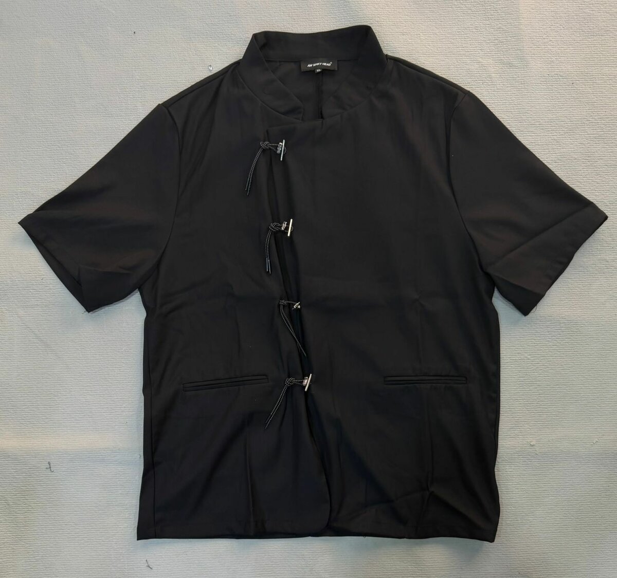 Blouse noire en tissu léger avec col Mandarin et liens à l'avant. Deux poches latérales et design moderne. Idéale pour un look chic et décontracté.