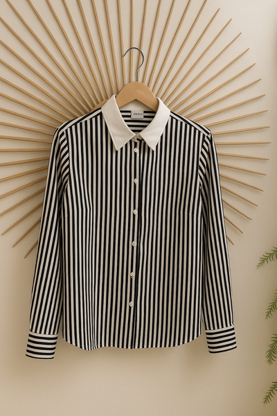 Cette blouse à rayures noires et blanches est parfaite pour un look chic et moderne. Polyvalente, elle se marie bien avec un pantalon ou une jupe, idéale pour le bureau ou sorties en ville.