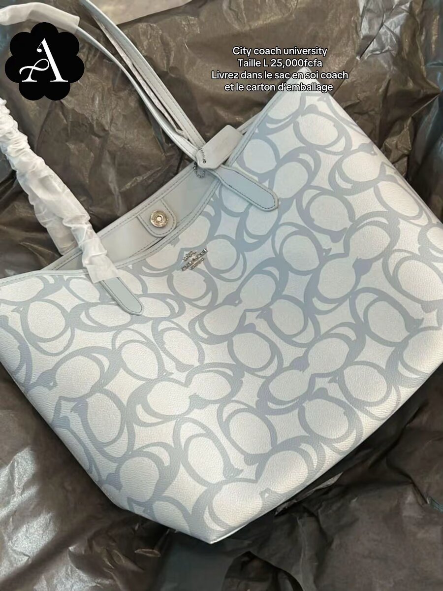 Elevate your style with this elegant Coach handbag paired with a charming keychain. The handbag features a classic white and grey pattern, while the keychain boasts a delicate pink bow and pearl details.