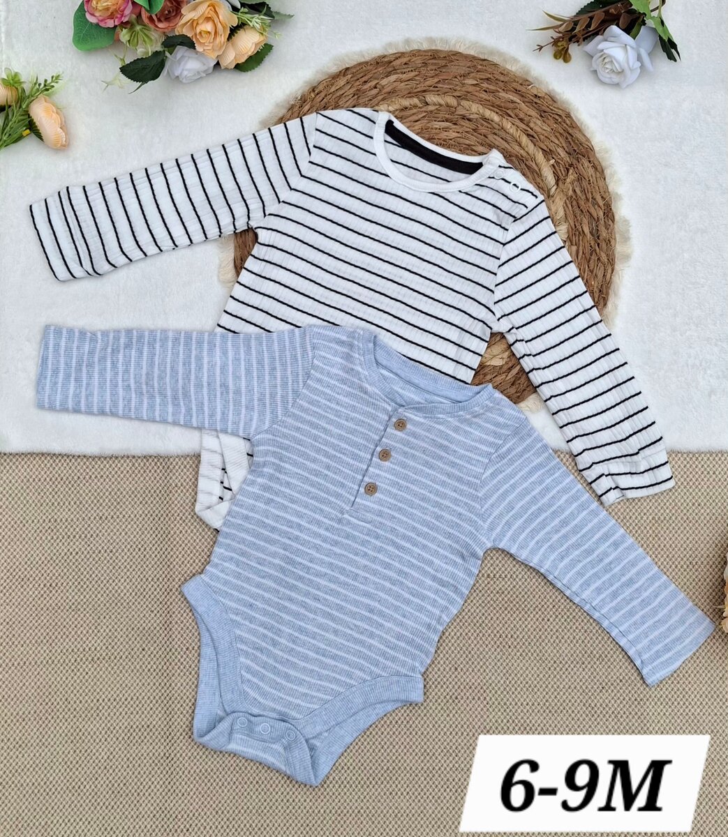 Lot de bodies rayés à manches longues pour bébé, tailles 6-9 mois. Confortables et doux, parfaits pour toutes les occasions. Faciles à enfiler grâce aux boutons pratiques.