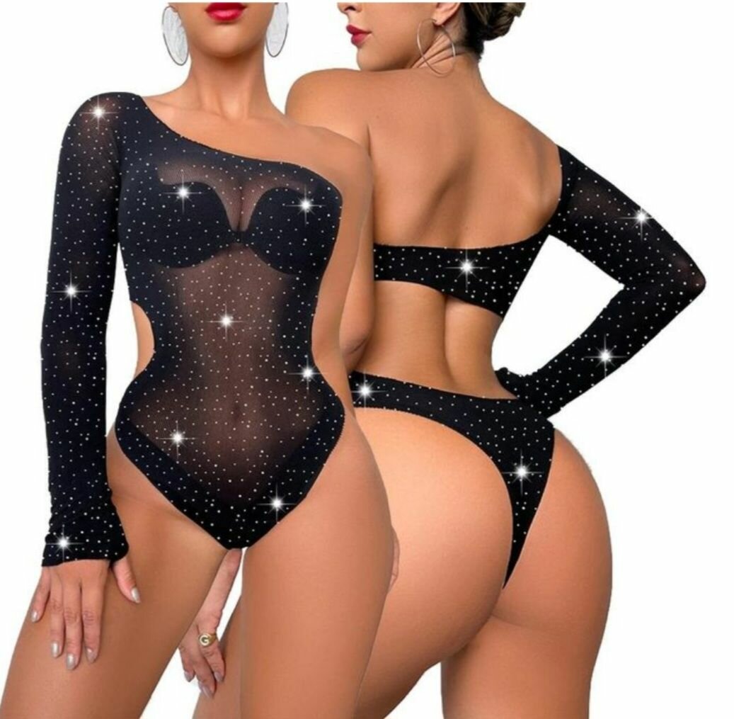 Charmant body noir à paillettes, asymétrique et séduisant. Idéal pour soirée ou tenue festive. Offre un look glamour et audacieux.