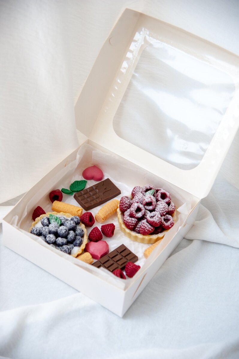 Эти кусочки мыла, оформленные в виде тарталеток с малиной и голубикой, содержат натуральные ароматы и ингредиенты. Уход за кожей станет истинным удовольствием с этими уникальными деталями: малинки, плиточки шоколада и вафельки добавляют особый шарм.