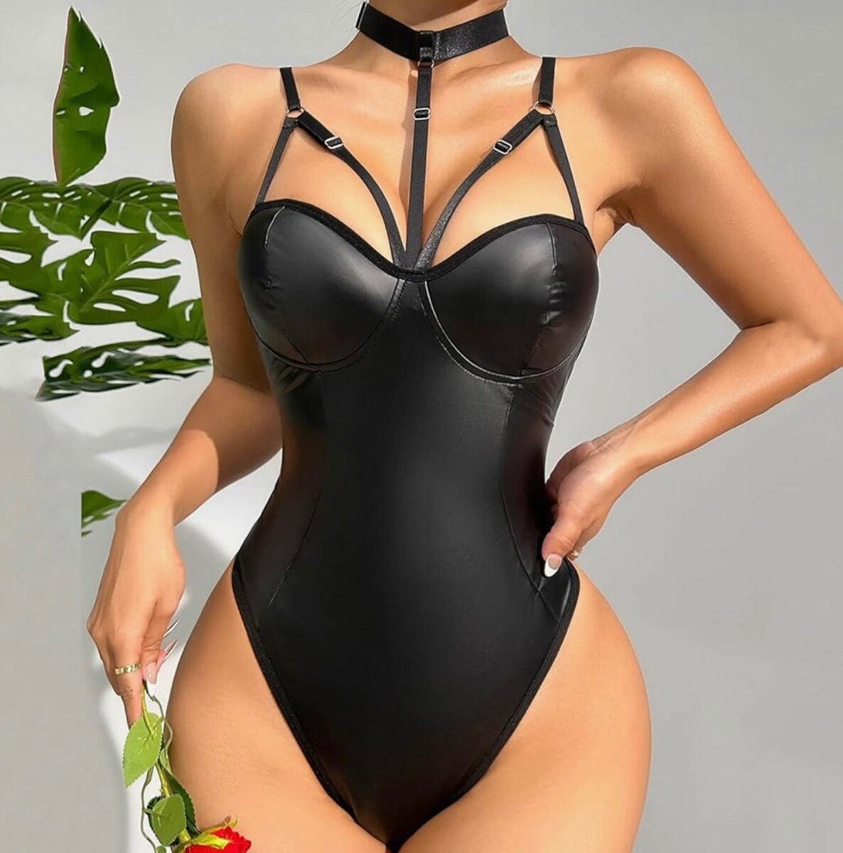 Découvrez ce body en cuir noir audacieux, parfait pour ajouter une touche de glamour et de mystère à votre garde-robe. Avec des découpes sophistiquées et des bretelles ajustables, il assure un ajustement parfait et flatteur. Idéal pour des occasions spéciales ou simplement pour se sentir incroyable à tout moment. Sa conception unique garantit un confort optimal tout en accentuant vos courbes. Faites de chaque moment un instant inoubliable avec ce choix séduisant.