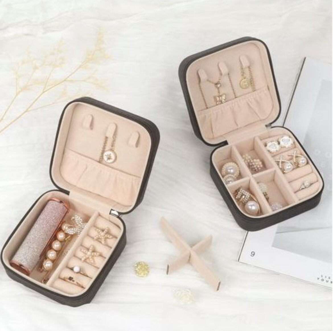 Organisez vos bijoux avec style grâce à cette boîte portable élégante. Parfaite pour les voyages, elle garde vos accessoires intacts et à portée de main. Idéal pour les bagues, colliers et boucles d'oreilles. Design compact et chic pour chaque femme moderne!