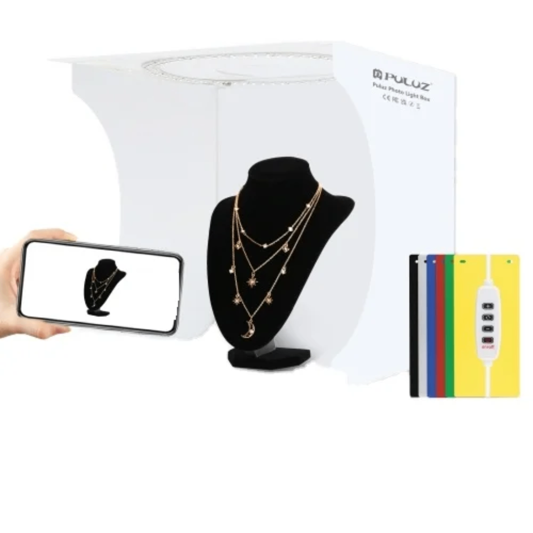 Découvrez la boîte à lumière photo Puluz, idéale pour des photos de produits professionnelles. Parfaite pour les bijoux, cette boîte portable offre un éclairage uniforme et multicolore. Facile à utiliser et à transporter, avec différents fonds pour de multiples styles.