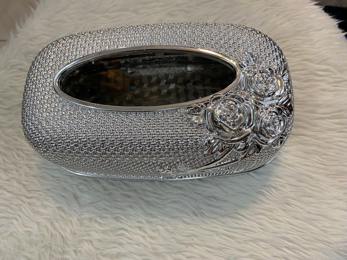Élégante boîte à mouchoirs en métal, idéale pour sublimer votre intérieur. Finition argentée et motifs floraux raffinés pour une touche de luxe. Parfaite pour le salon ou la salle de bain.