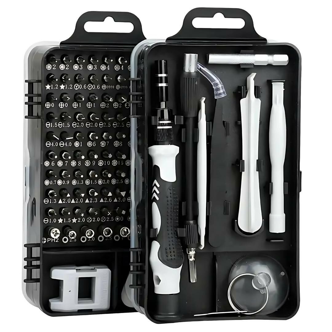 tournevis 115 en 1. Parfait pour la réparation d'électronique, il inclut toutes les embouts nécessaires dans une boîte pratique. Idéal pour les amateurs et professionnels