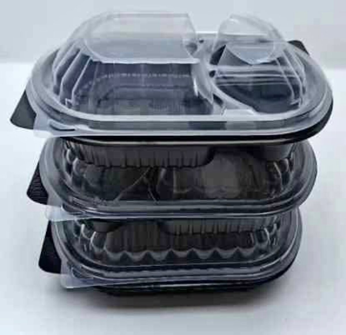 Boîtes alimentaires jetables en plastique noir avec couvercle transparent pour la préparation et le stockage de repas. Elles sont idéales pour les restaurants, les livraisons de repas et les pique-niques