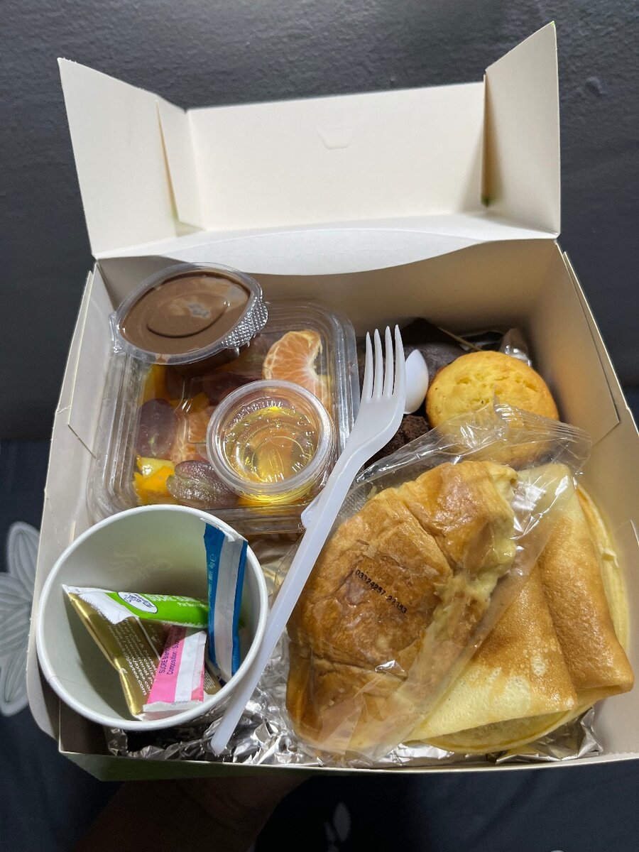 Une délicieuse box avec une salade de fruits , un pot de chocolat , du sirop, des crêpes&pancakes, des brownies , un cake au yaourt , un croissant et du thé chaud pour bien démarrer la journée