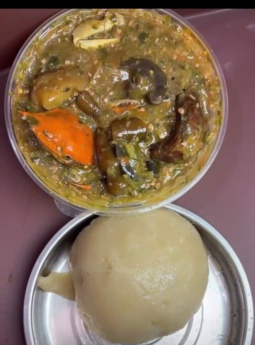 Une sauce gombo bien gluante, préparée avec des crabes, tripes et viandes tendres, servie avec un placali chaud et moelleux