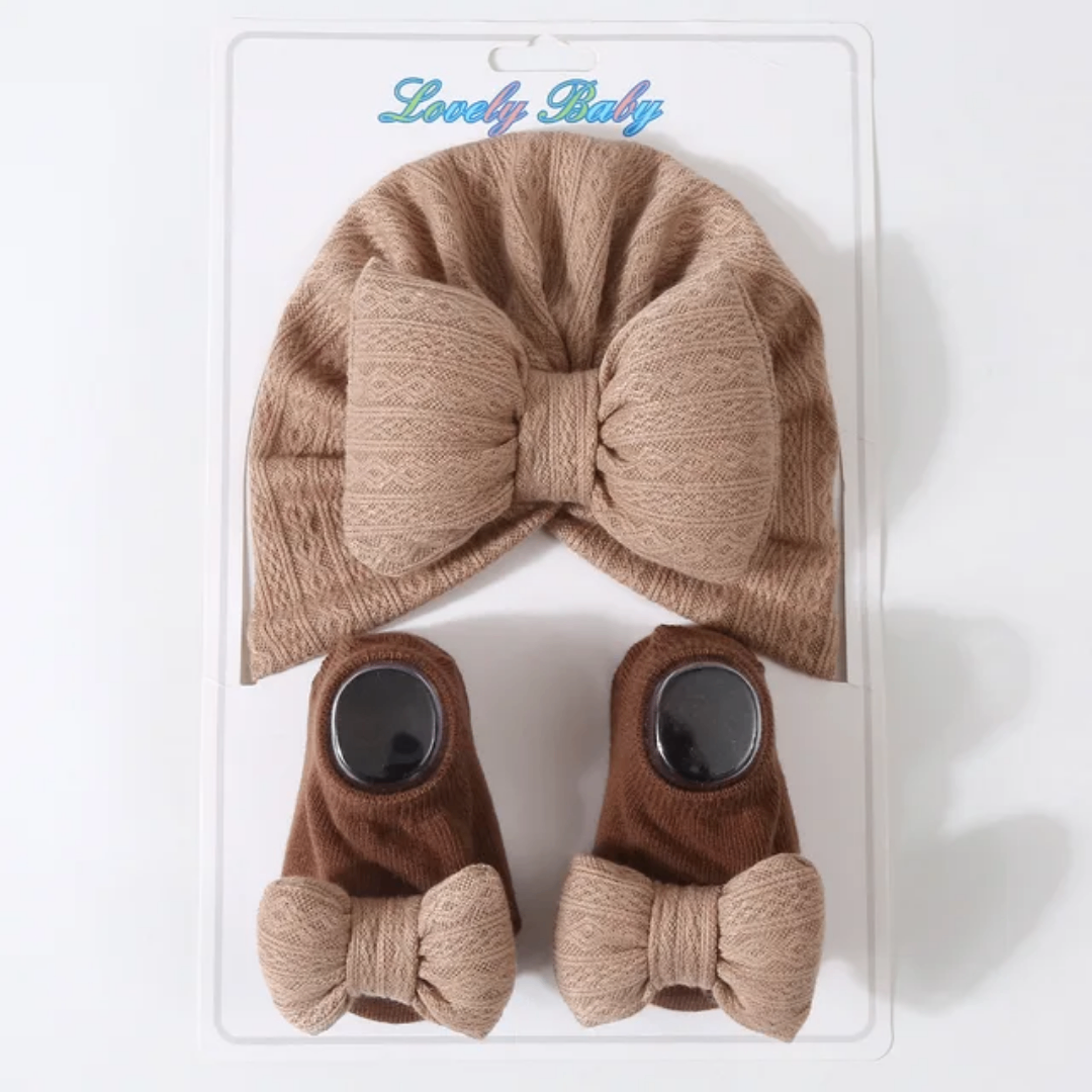 Adorable ensemble bonnet et chaussons pour bébé, couleur marron, avec jolis nœuds. Conçu pour garder votre bébé au chaud et stylé. Parfait pour les sorties et les occasions spéciales. Taille confortable et élastique.