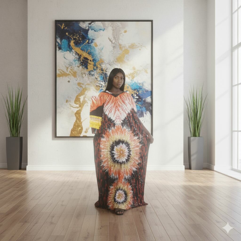 Robe longue bohème chic avec des motifs vibrants et colorés. Parfaite pour une soirée estivale ou une journée décontractée. Confortable et élégante, cette robe est un choix idéal pour celles qui aiment se démarquer avec style.