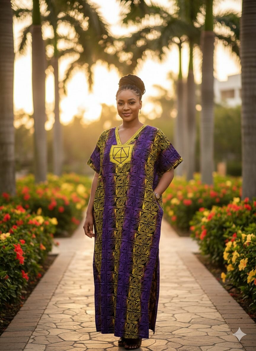 Affirme ton style avec ce boubou aux motifs géométriques audacieux en violet et jaune. Confectionné dans un tissu fluide et lumineux, il célèbre la tradition avec une touche contemporaine. Sa coupe ample et majestueuse offre confort et prestance, idéale pour les grandes occasions ou les moments où lon veut simplement rayonner.