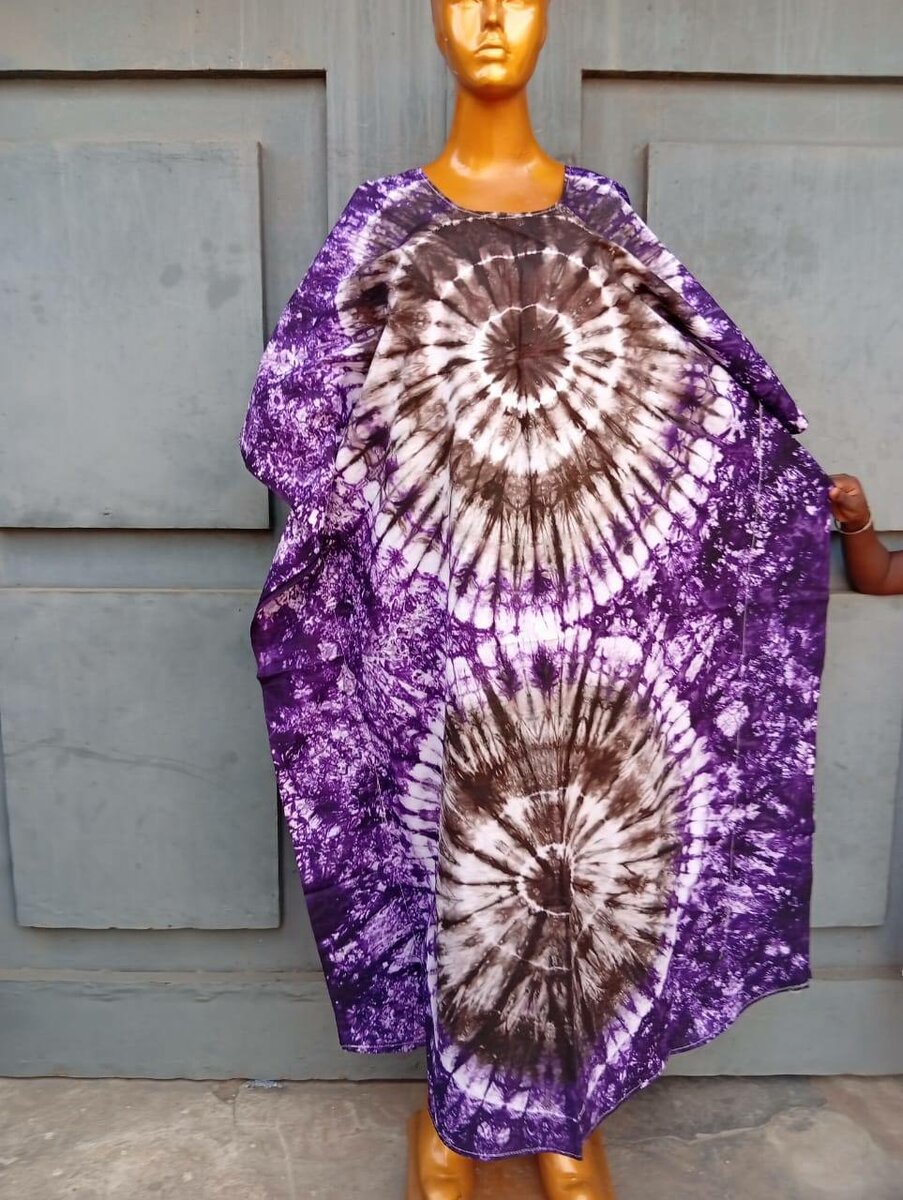 Poncho ample et élégant, fabriqué à partir de tissu confortable avec un motif tie-dye violet et marron. Idéal pour une tenue décontractée ou comme pièce maîtresse de votre style.