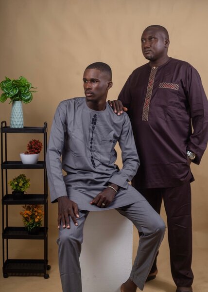 Grand boubou gris homme, broderies géométriques, coupe large. Idéal mariages et occasions spéciales.