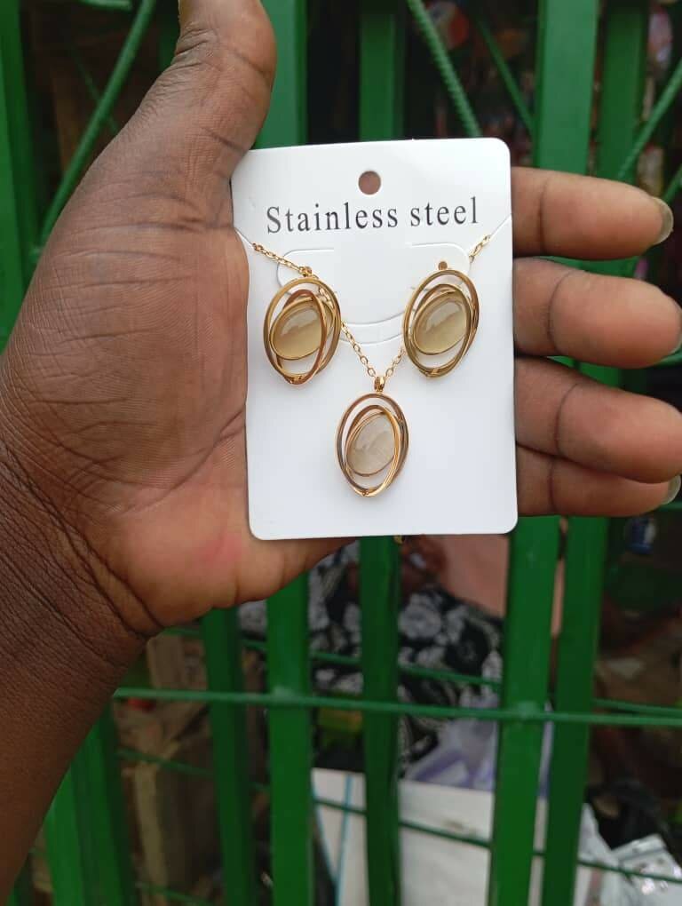 Élégant ensemble de bijoux en acier inoxydable comprenant un collier et des boucles d'oreilles.