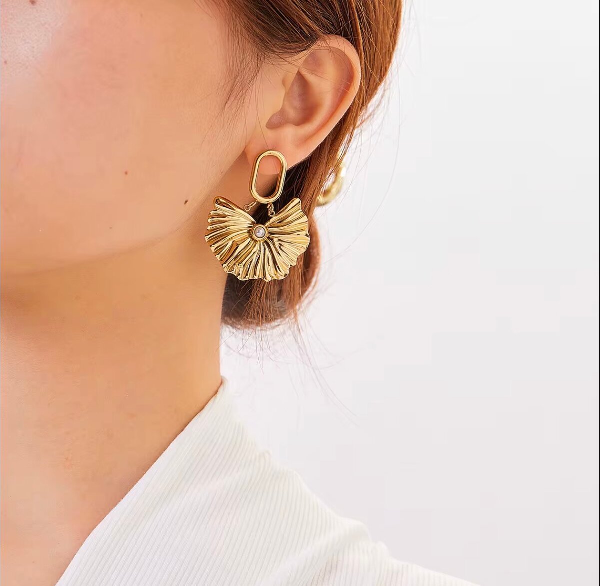 Ajoutez une touche de sophistication avec ces boucles d'oreilles dorées. Leur design raffiné et unique, orné d'un élégant pendentif en éventail, est parfait pour toutes les occasions. Idéales pour mettre en valeur votre style.