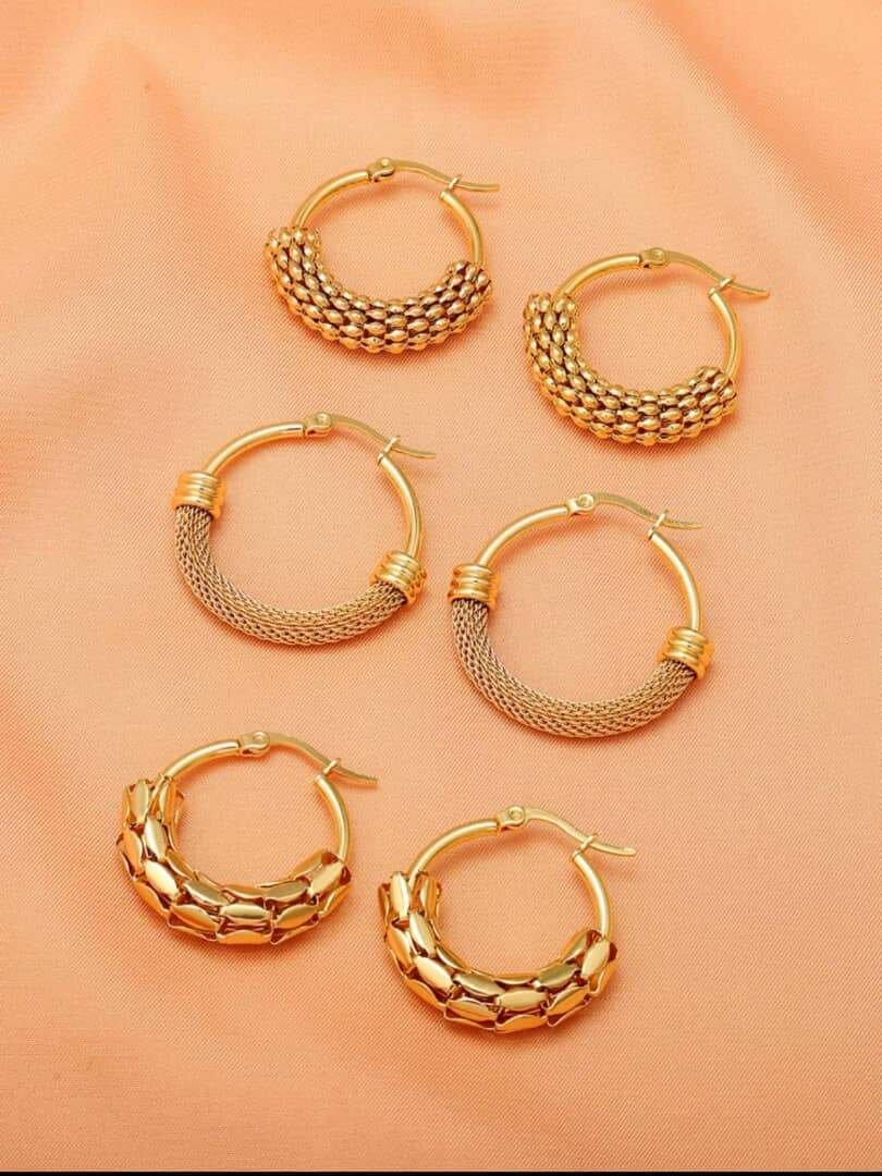 Sublimez votre style avec ces boucles d'oreilles en acier inoxydable doré au design élégant et texture unique. Parfaites pour une soirée glamour ou un look quotidien chic. NB: Lot de 3