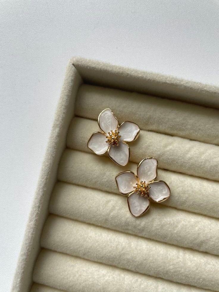 Élégantes boucles d'oreilles en forme de fleur, ornées de perles nacrées et de détails dorés.