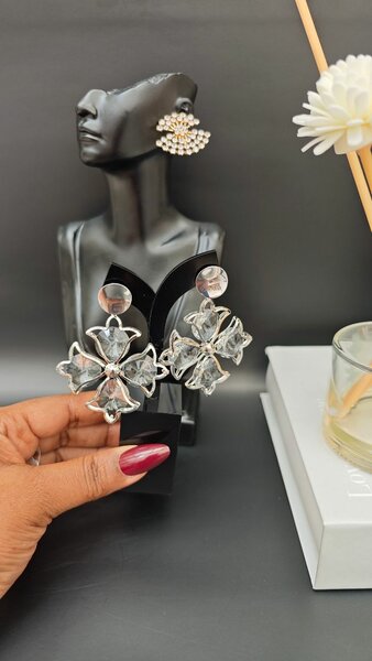 Élégantes boucles d'oreilles en forme de fleur avec un centre perlé et des strass étincelants. Idéales pour ajouter une touche glamour à toute tenue.