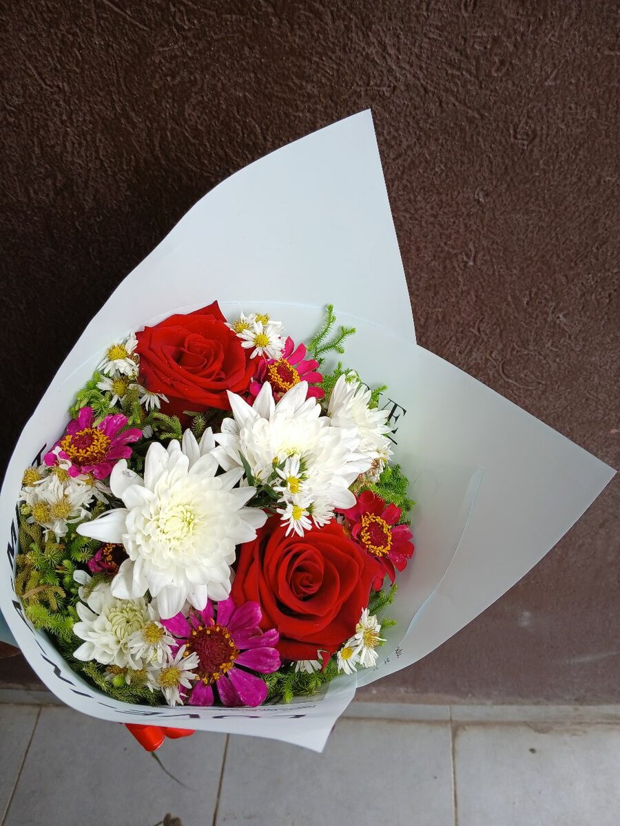 Offrez ce magnifique bouquet de fleurs colorées pour exprimer vos sentiments. Composé de roses rouges, de marguerites blanches et de fleurs violettes, il est parfait pour toutes les occasions. Son design élégant et vibrant apporte une touche de nature et de gaieté à n'importe quel espace. Idéal pour les anniversaires, mariages ou tout simplement pour faire plaisir.