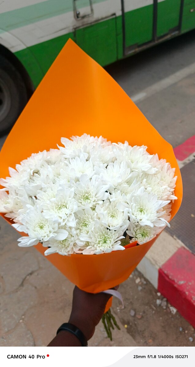 Magnifique bouquet de chrysanthèmes blancs, idéal pour les occasions spéciales comme un anniversaire ou une déclaration d'amour. Emballé avec soin dans un papier orange vif.