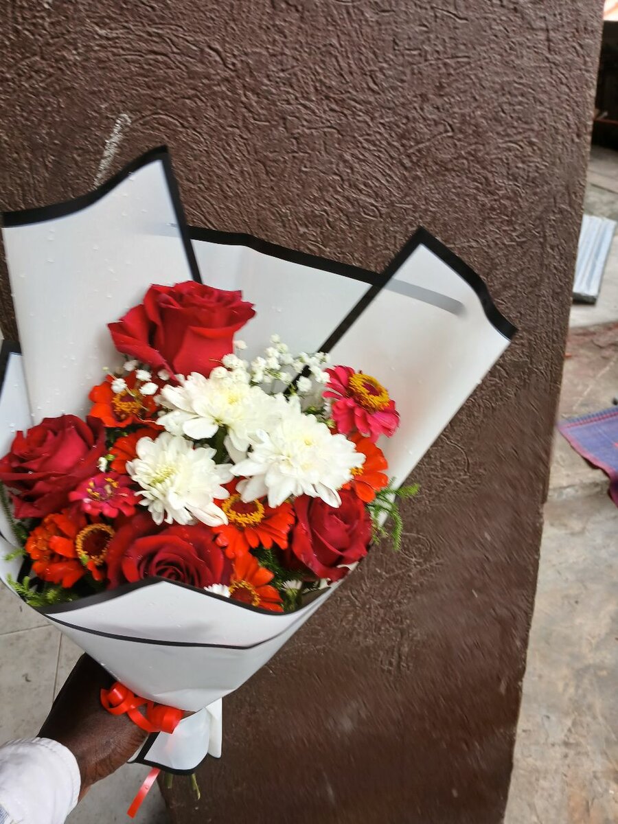 Offrez ce bouquet vibrant de roses rouges et fleurs blanches. Parfait pour toutes les occasions, il apportera une touche de couleur et d'élégance.