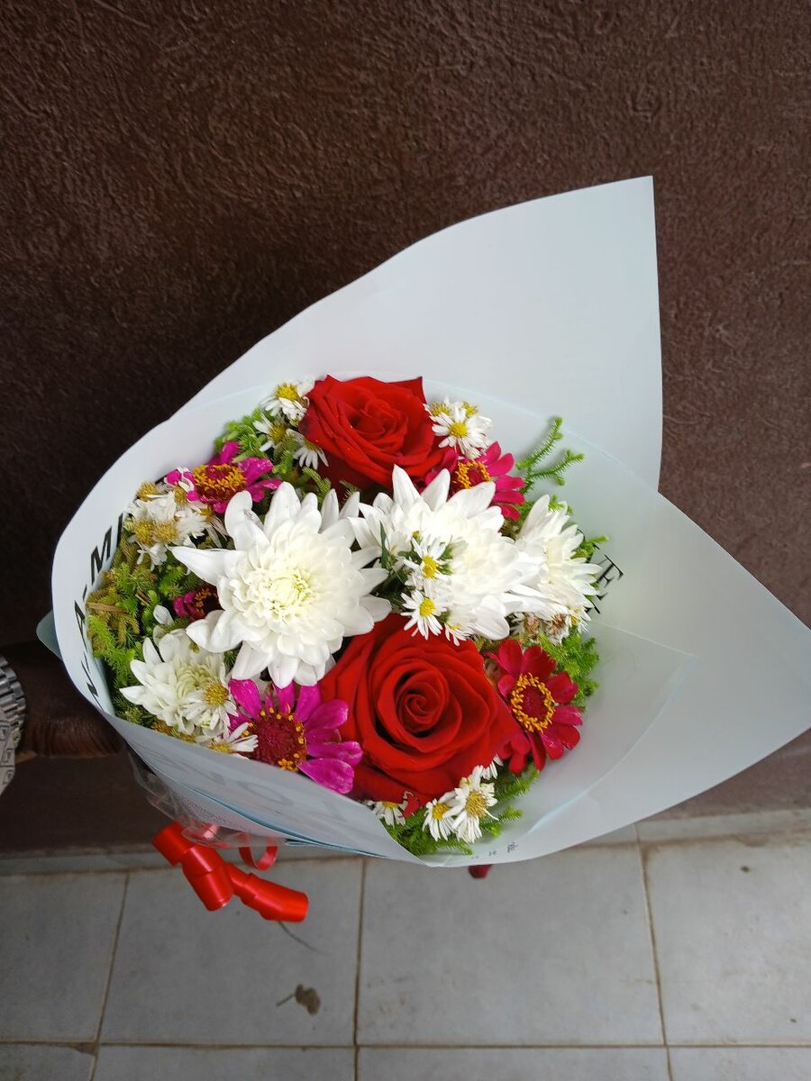 Magnifique bouquet de fleurs comprenant des roses rouges et des marguerites blanches. Idéal pour célébrer une occasion spéciale ou simplement pour décorer votre intérieur. Offrez un instant de bonheur avec ce mélange coloré et élégant.