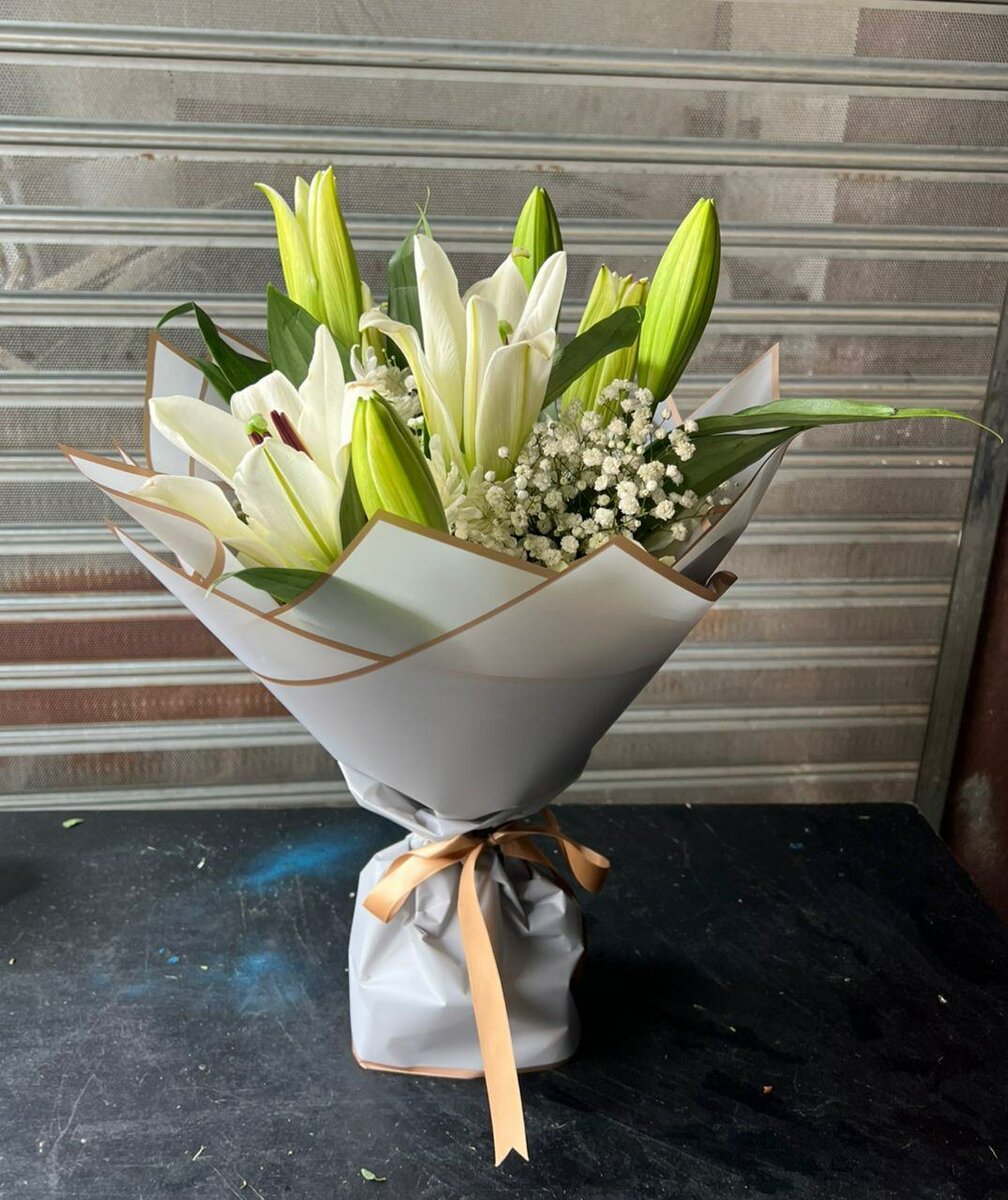 Offrez un bouquet de lys blanc éclatant, parfait pour toutes les occasions spéciales. Composition élégante avec des touches de gypsophile, idéale pour un cadeau raffiné. Apportez une touche naturelle et fraîche à votre intérieur ou surprenez un être cher avec ce bouquet ravissant.