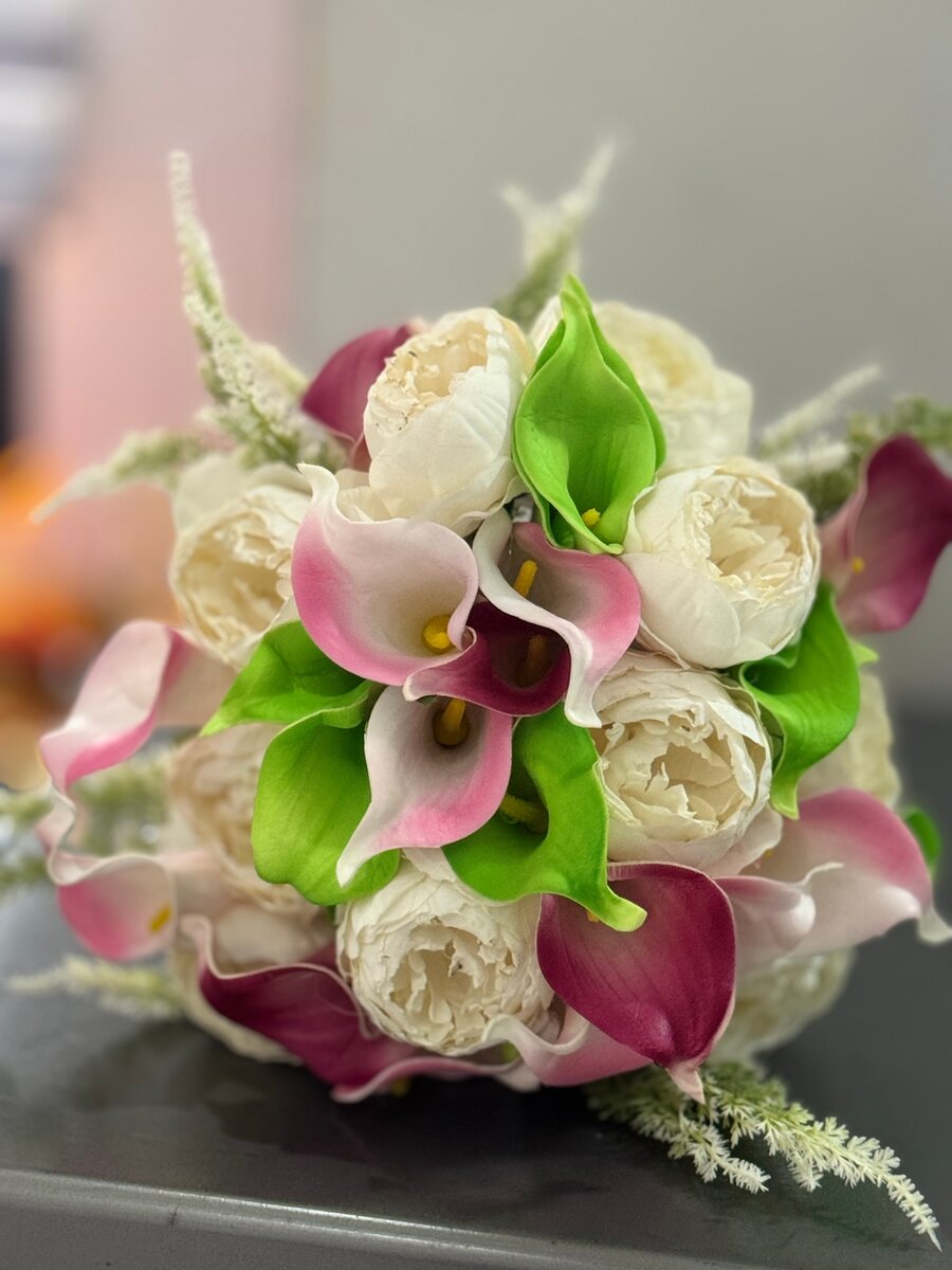 Ce magnifique bouquet de mariée combine des fleurs blanches et roses avec une touche de vert, parfait pour une cérémonie d'élégance. Idéal pour rendre mémorable votre journée spéciale.