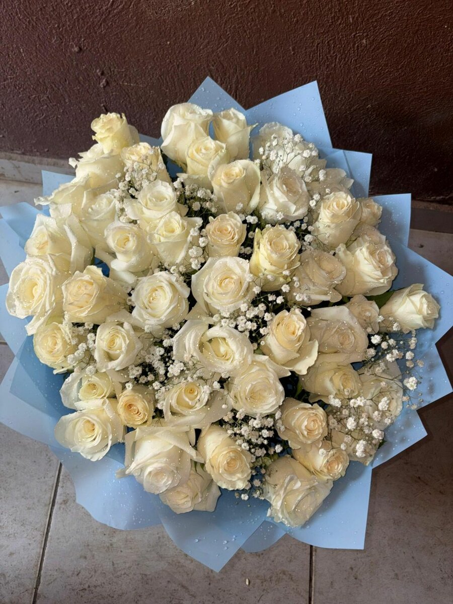 Magnifique bouquet de roses blanches fraîches, accompagnées de fleurs de baby's breath pour une touche élégante. Idéal pour les occasions spéciales comme un mariage, un anniversaire ou pour exprimer votre amour.