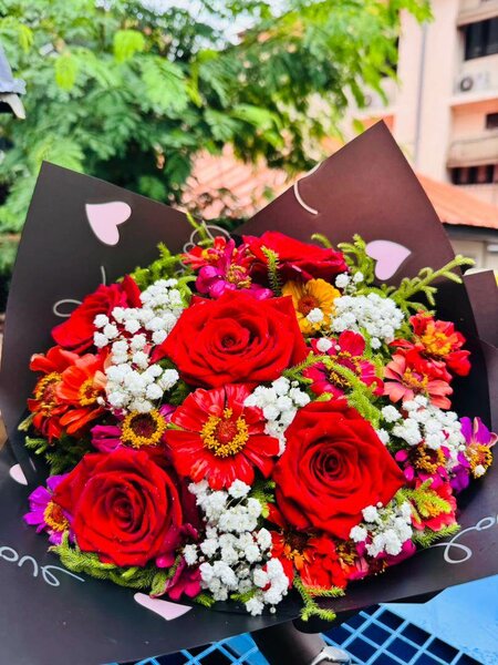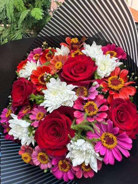 Découvrez ce somptueux bouquet de roses rouges et oranges, parfait pour offrir lors d'occasions spéciales. Son mélange vibrant de couleurs apporte chaleur et élégance à tout environnement. Idéal pour surprendre vos proches.