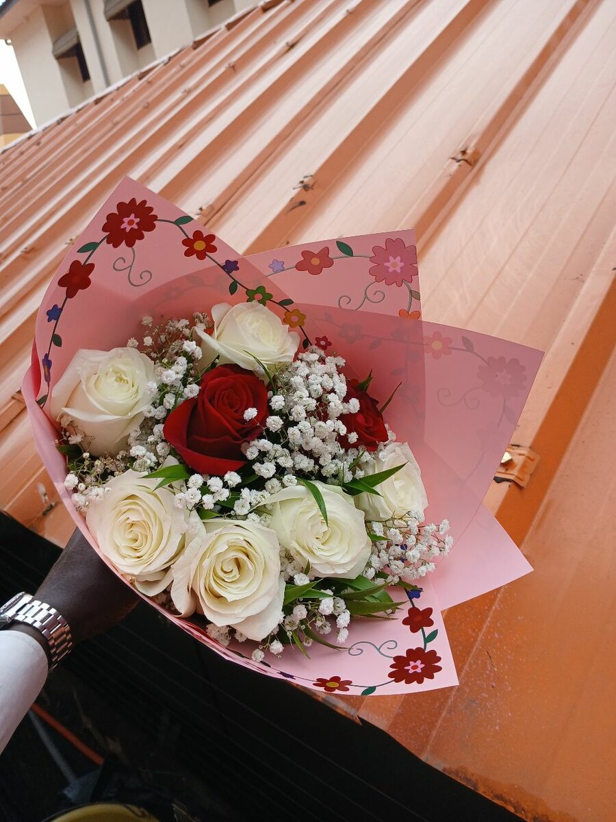 Charmant bouquet de roses rouges et blanches, parfait pour célébrer l'amour et la tendresse. Idéal pour les anniversaires, mariages ou occasions spéciales. Papier décoratif floral inclus pour une touche de romance supplémentaire.