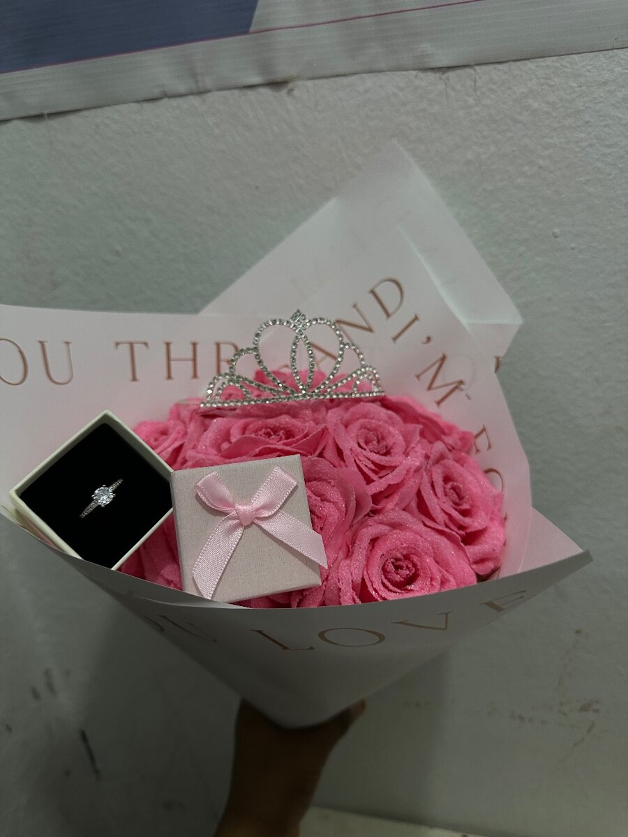 Éblouissant bouquet de roses roses avec un diadème scintillant, accompagné d'une élégante bague dans un écrin. Idéal pour des occasions spéciales comme des demandes en mariage ou anniversaires.
