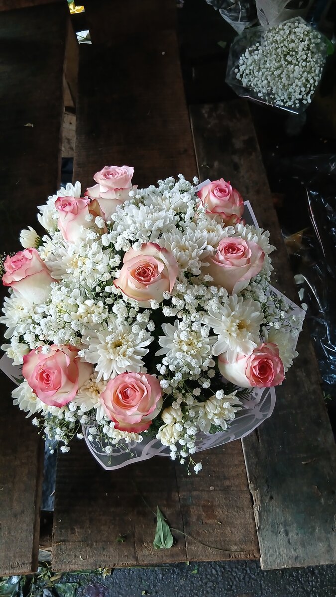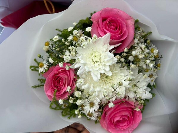 Ce magnifique bouquet combine gracieusement des roses roses et des fleurs blanches délicates, parfait pour exprimer votre affection lors d'occasions spéciales. Offrez-le pour un anniversaire, une célébration ou simplement pour égayer une journée.