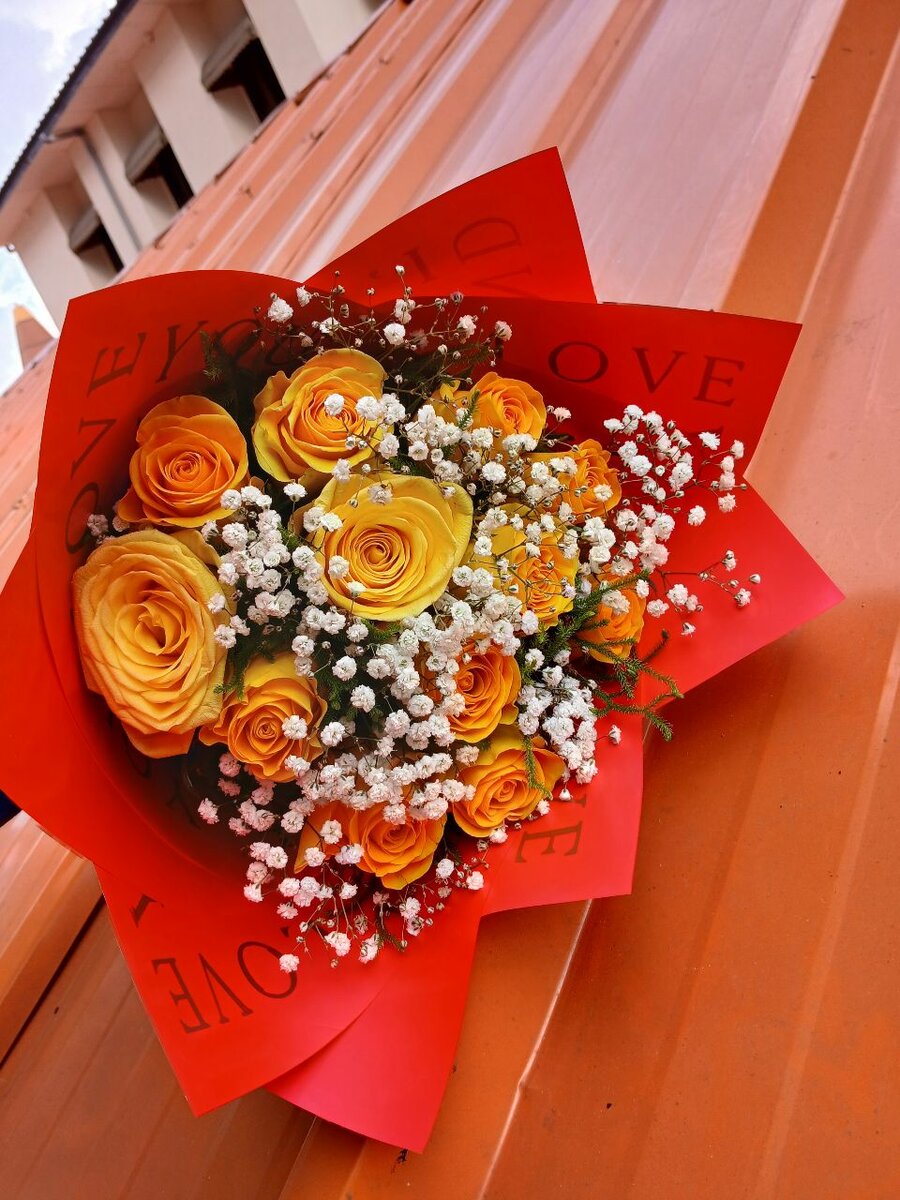 Ce bouquet de roses orange vibrant est parfait pour illuminer votre journée. Idéal pour offrir lors d'anniversaires ou de célébrations, il ajoutera une touche d'élégance et de couleur à tout événement. Les roses fraîches sont accompagnées de gypsophile délicate, le tout enveloppé dans un papier rouge chic. Offrez un sourire et un peu de beauté naturelle à vos proches.