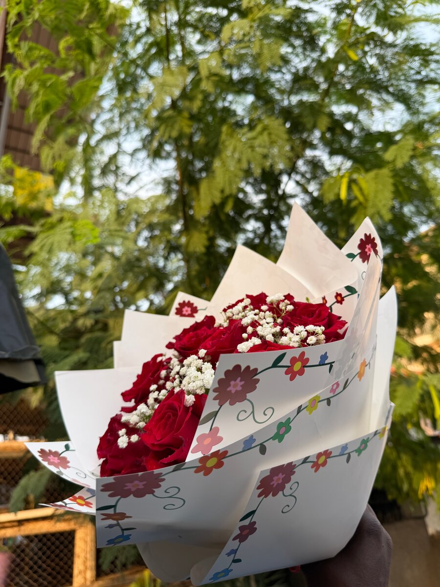 Un magnifique bouquet de roses rouges fraîches avec gypsophile, emballé avec élégance. Parfait pour les occasions spéciales comme la Saint-Valentin, un anniversaire ou pour exprimer votre amour.