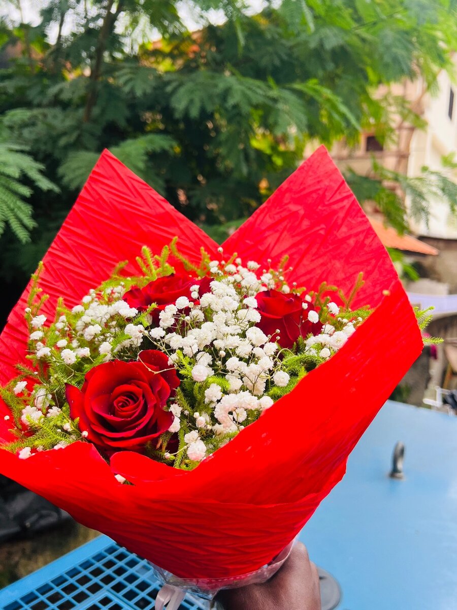 Magnifique bouquet de roses rouges et gypsophiles, idéal pour des occasions spéciales. Offre une élégance intemporelle et charme. Parfait pour anniversaires, mariages ou déclarations romantiques.