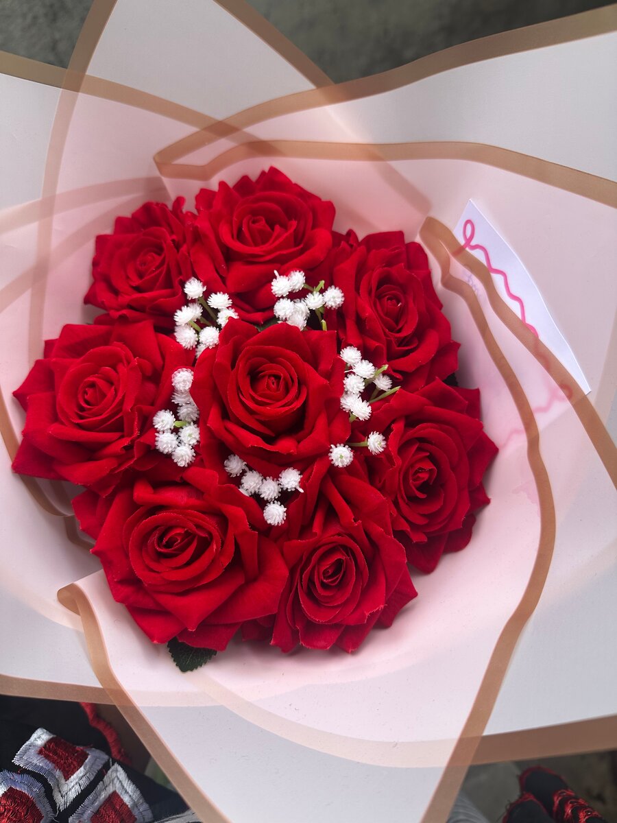 Ce magnifique bouquet de roses rouges est le choix idéal pour exprimer vos sentiments les plus profonds. Composé de roses éclatantes et agrémenté de délicates petites fleurs blanches, il est parfait pour toute occasion romantique ou comme cadeau élégant. Offrez-le pour un anniversaire, un anniversaire de mariage, ou simplement pour montrer votre amour. Sa présentation soignée dans un papier raffiné en fait un cadeau prêt à être offert et apprécié.