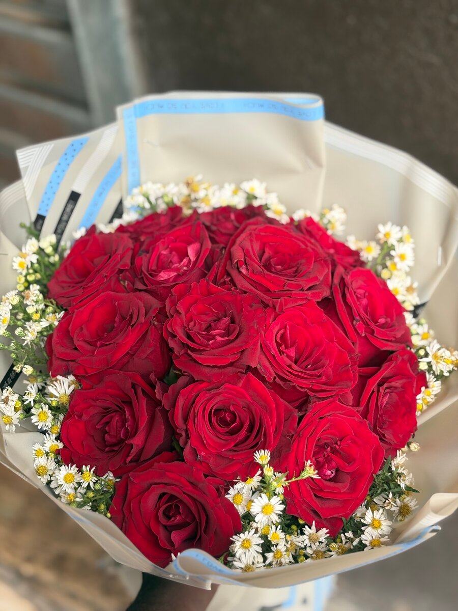 Éblouissant bouquet de roses rouges, idéal pour exprimer vos sentiments les plus profonds. Accompagné de petites fleurs blanches délicates, ce bouquet est parfait pour célébrer l'amour, les anniversaires ou toute occasion spéciale. Offrez un instant de bonheur floral.