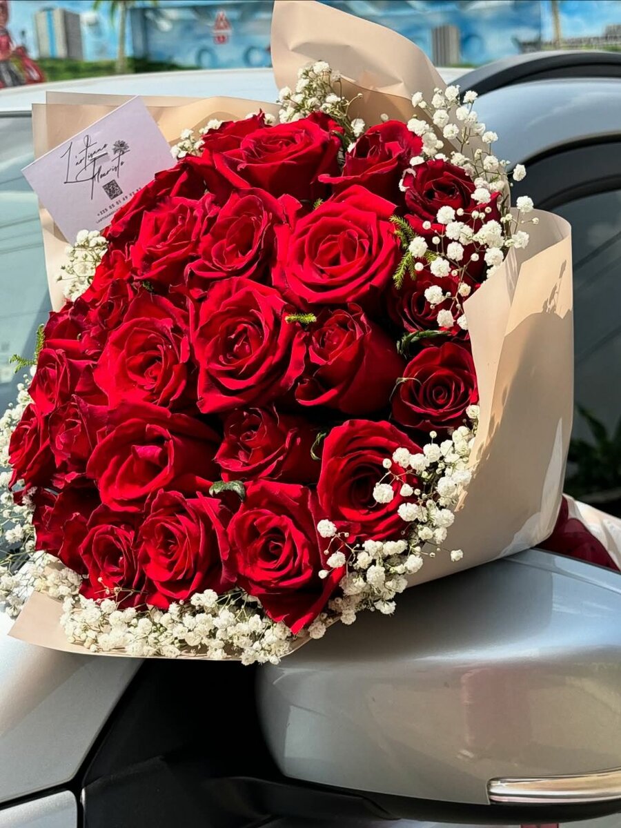 Offrez un bouquet de roses rouges éclatantes, agrémenté de délicates gypsophiles. Parfait pour exprimer amour et affection lors de toute occasion spéciale.