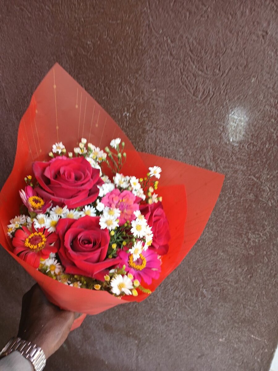 Offrez un bouquet éclatant de roses rouges et marguerites blanches. Parfait pour toutes les occasions spéciales, ce bouquet apportera joie et élégance.