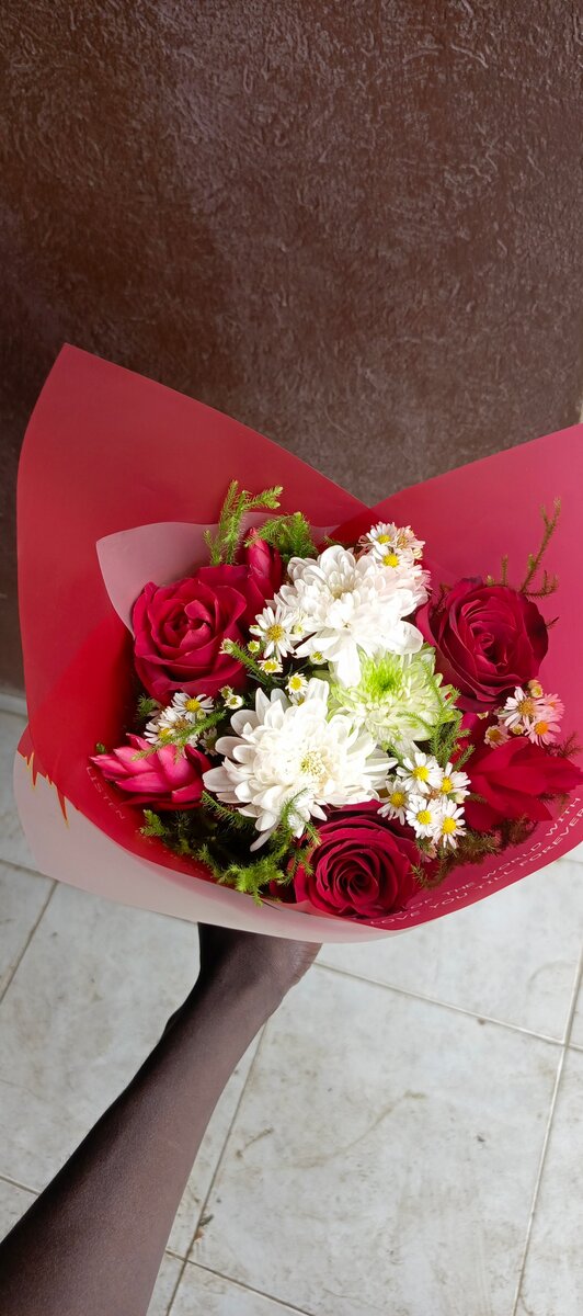 Une magnifique bouquet mixte avec des roses rouges et des fleurs blanches, parfait pour exprimer vos émotions. Idéal pour les anniversaires, les mariages ou juste pour dire je t'aime. Offre une touche raffinée à tout événement.
