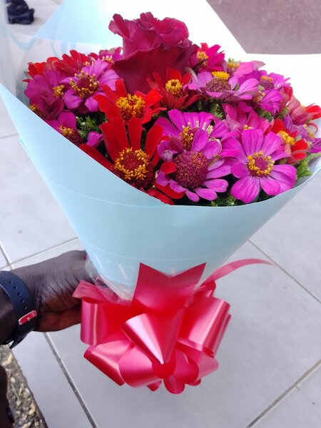 Un bouquet de fleurs fraîches avec des roses rouges et des marguerites blanches, parfait pour toutes les occasions spéciales. Ajoutez une touche d'élégance à vos moments précieux avec ce magnifique arrangement floral.