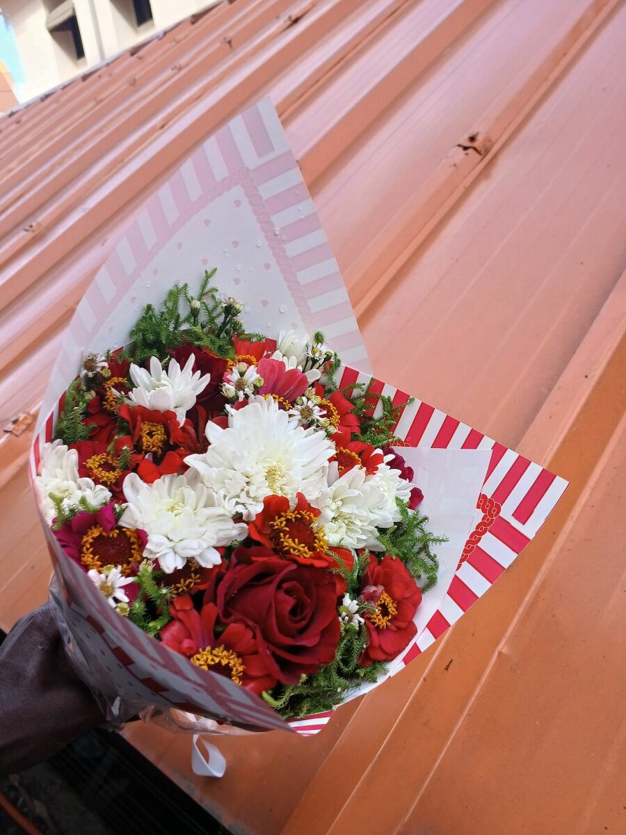 Bouquet floral éclatant avec roses rouges et fleurs blanches, idéal pour célébrations. Éblouissez vos proches avec ce bouquet magnifique et coloré, parfait pour toutes les occasions.
