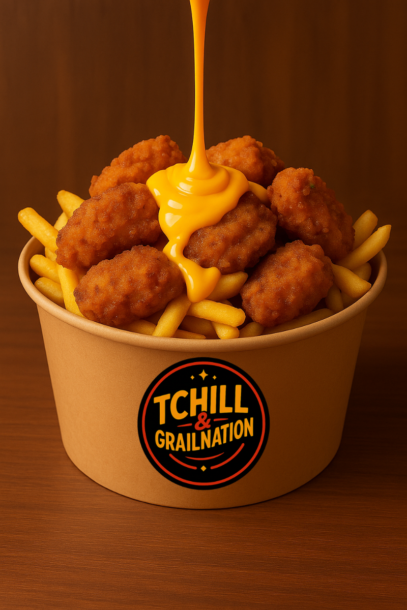 Savourez ces délicieux nuggets de poulet croustillants accompagnés de frites dorées, le tout nappé d'une onctueuse sauce au fromage. Parfait pour un repas rapide ou une pause gourmande!