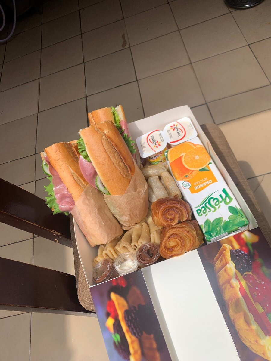 Jus croissant, crêpes, sandwich, jus , mens , yaourt