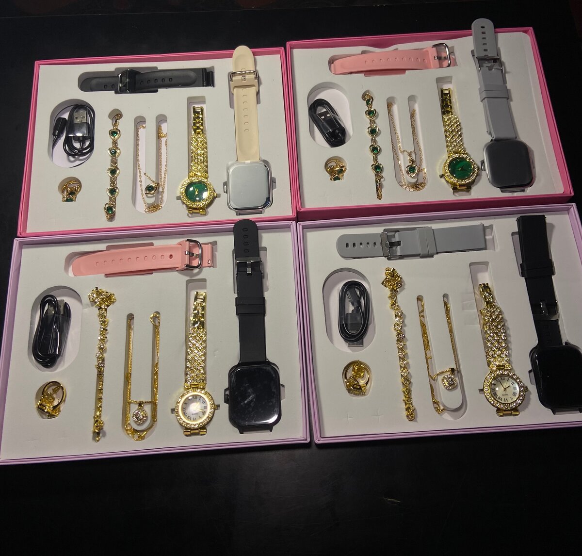 Un cadeau idéal à offrir à une personne Box composé de deux montres un bracelet une chaîne des boucles oreilles et une bague